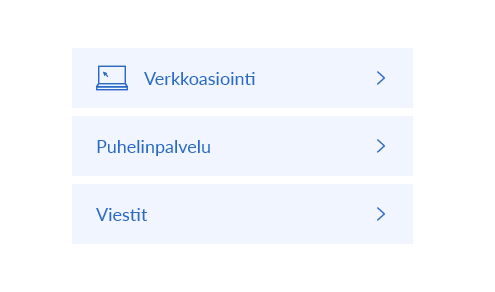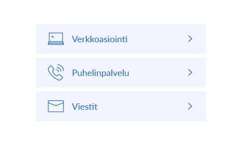 Käytä kuvakkeita yhtenäisesti – tuttu kuvakieli tukee sisällön silmäilyä. Esimerkiksi verkkopalvelu tai puhelinasiointi kannattaa esittää samalla kuvakkeella käyttöliittymän ja asiakaspolun kaikissa osissa.